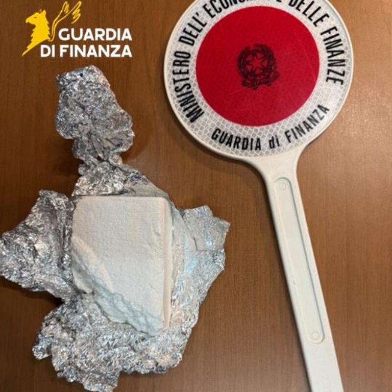 A seguito di perquisizione personale e del mezzo, è stato rinvenuto, all’interno del marsupio del conducente, 1 panetto avvolto da carta argentata contenente una sostanza di colore bianco, il cui esame speditivo attraverso il drop test ha dato esito positivo in quanto sostanza stupefacente di tipo cocaina.